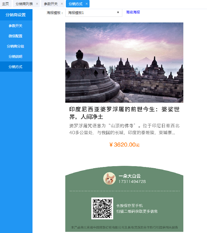 另外,對于有美工,制圖能力的用戶呢,思途也特別增加了高級海報插件。也就是說,商家可以根據自身的產品情況,針對不同的產品量身設計背景圖片上傳至后臺,而后臺則會為海報自動匹配產品二維碼。由此分享出去的海報,則能夠更直觀的傳遞旅行社自身的設計理念,滿足我們個性表達的需求。