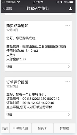 場景一:用戶小A通過微信端在手機網站上下單了峨眉山樂山二日游的跟團產品后,旅行社授權綁定的公眾號就會自動向小A推送一條購買成功通知的消息。而小A在旅游結束后,公眾號還有向小A推送訂單評價提醒與用戶產生互動。