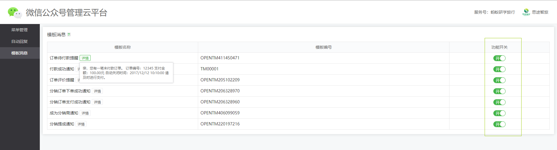 安裝了【公眾號模板消息】的旅游商家,就可以對綁定了微信號并關注了商家服務號的用戶及分銷商分別進行消息提醒: