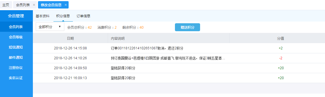 為了幫助大家更全面的管理網(wǎng)站會員的信息,本次我們新增了會員注冊來源、注冊時間等字段。也就是說升級之后,我們就可以在注冊會員的詳細信息中查看到他的注冊時間和來源,從而掌握不同渠道(如PC、微信、小程序等)的具體引流效果。而且在最新的版本中,管理員還可以針對某些特別的會員或老會員手動贈送積分,也就意味著,相比以前會員只能通過積分策略獲取積分,我們的管理員可以更靈活控制積分啦!