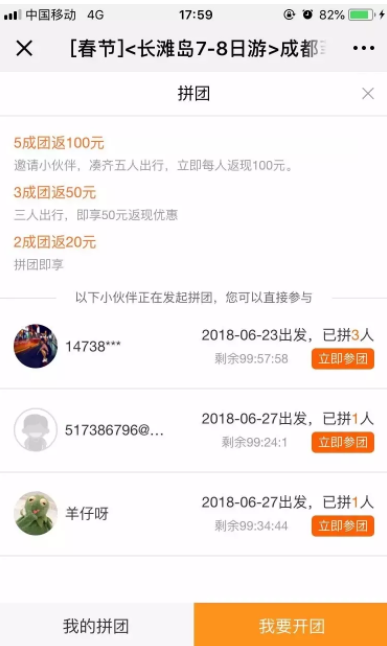 拼多多這兩年來可火得不要不要的,最近還成為中國用戶數第二大的電商平臺。它的成功,向我們證明了“拼團”+“低價”的策略結合微信的社交屬性,確實大有市場。而思途為旅游電商量身打造的拼團購買應用,商家不必“割利賤賣”,直接通過多買返現的策略,來刺激用戶在手機端進行發團或拼團,從而帶動更多新客戶成交,還能將零散的網站游客通過拼團組合在一起,也進一步提升了網站流量的成交轉化。