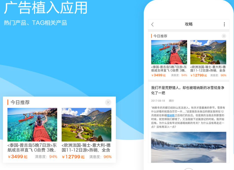 大家出行前都喜歡先在手機上查查攻略游記,如果我們商家在他們瀏覽頁面的過程中,能夠剛好給他們推送相關的線路、酒店等產品,用戶會不會在看到這些推薦后,產生了解興趣,進而點擊內容頁呢?采用熱門或者Tag詞匹配的方式來吸引用戶點擊,能夠讓我們獲得更為精準的流量。這種有效的引流方式,同樣也可使用思途的廣告植入應用來實現哦!