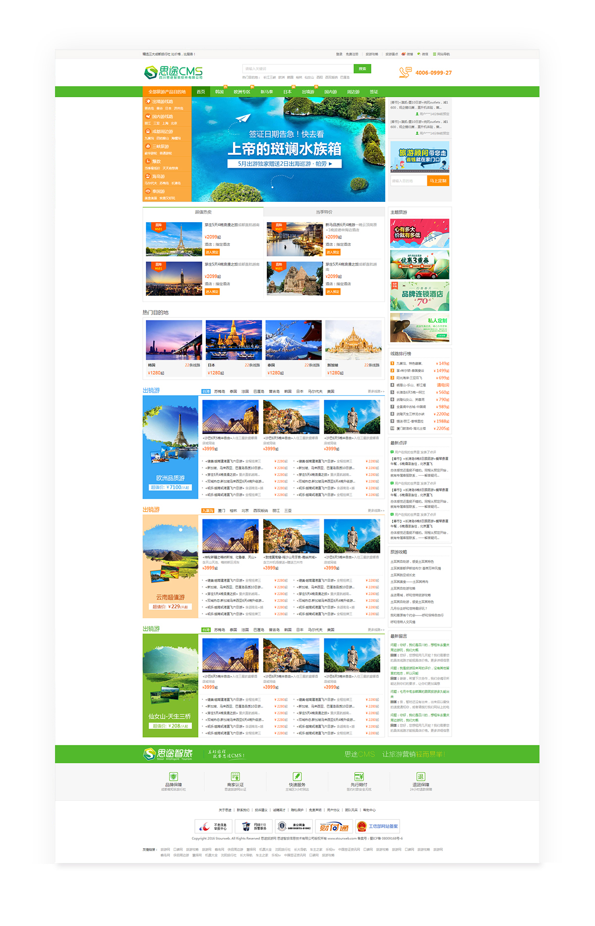 (網站首頁)此套綠色小清新線路首頁模板以旅游目的地和線路為主,可根據經營業務設置出境游,國內游,周邊游等多種旅游線路類型。模板首頁顯示內容豐富:主推線路,熱門目的地,主題旅游板塊位于瀏覽器首屏,利于進行營銷推廣;首頁能夠同時展示豐富旅游目的地和旅游線路,內容充實,選擇多樣。此套綠色小清新線路首頁模板適合主要經營旅游線路的大、中、小型旅游網站使用。* 該模板不支持自定義導航,右側僅支持效果圖上模塊。該模板不支持換膚。