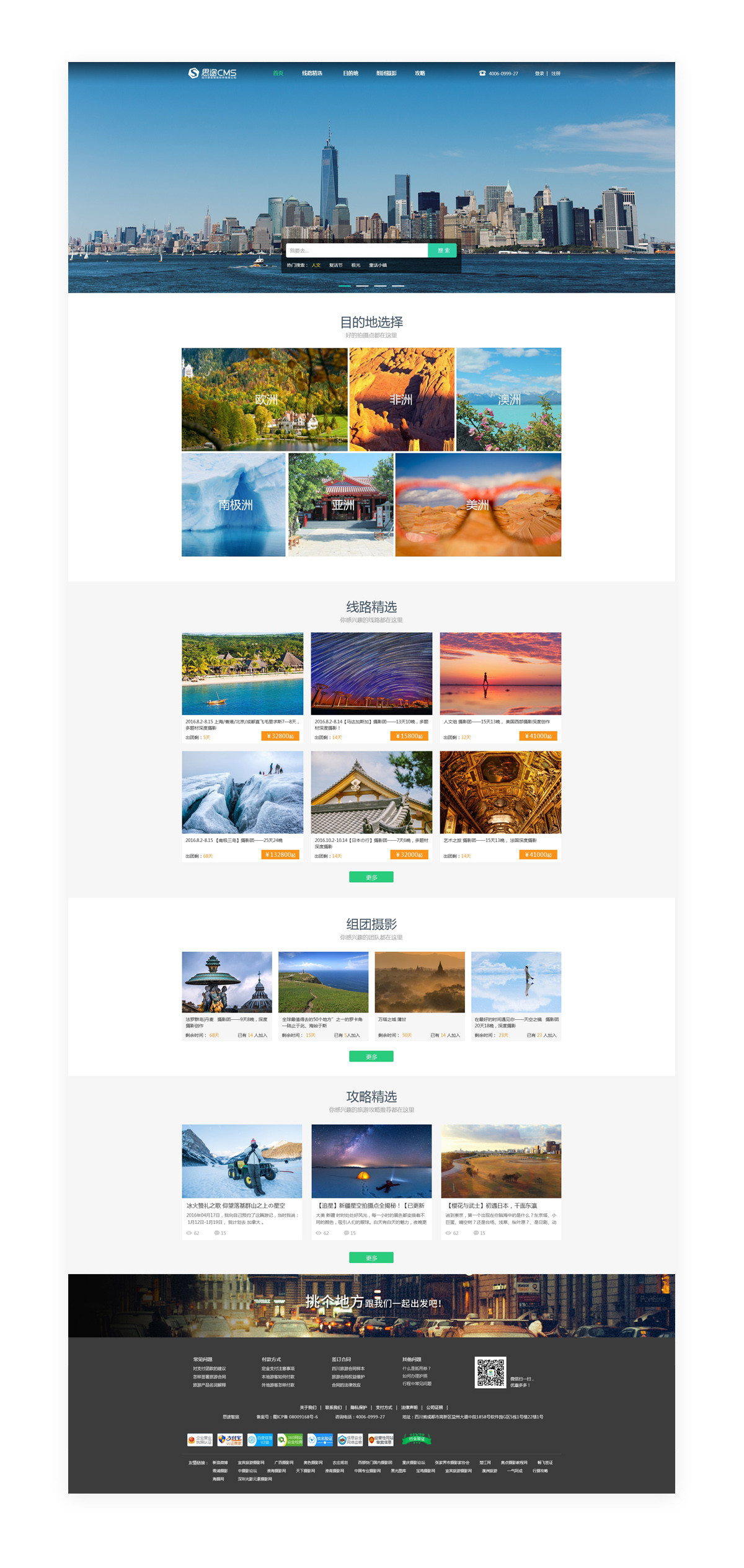 (網站首頁)此套模板適合以旅游攝影,旅游攻略為主的旅游網站建設。網站頂部banner簡潔大氣,突顯網站風格。網站首頁呈現形式以圖片為主,具有極強的視覺吸引力。以攝影為主題,可制定精選旅游線路,開展旅游攝影活動。此套簡潔大氣攝影首頁模板,具有超高人氣和極強辨識度,非常適合旅游攝影網站建設需要。* 該模板不支持二級導航,不支持自定義導航,不支持右側模塊。該模板不支持換膚。