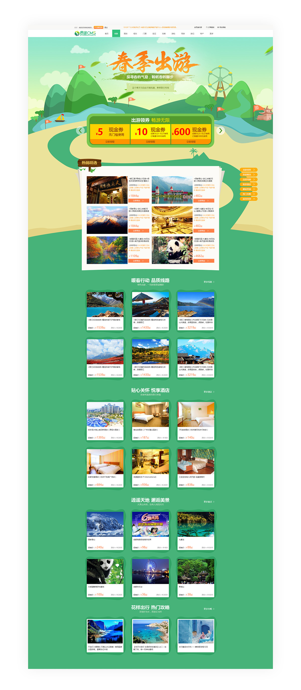 (專題頁)此模板為綠色春季專題模板。模板以綠色為主題背景顏色,頁面在整體設計上突出春的氣息和春的元素,適合用來作為春季出游的專題模板。頁面可以設置展示多種旅游產品和優惠券信息,具有較強的產品吸引力和活動營銷元素。綠色春季主題模板能為網站提供良好的營銷效果,建議旅游網站提前購買,設置產品,為春季活動、促銷做準備。*使用此模板需提前安裝全新專題應用(No.67)該模板不支持換膚。